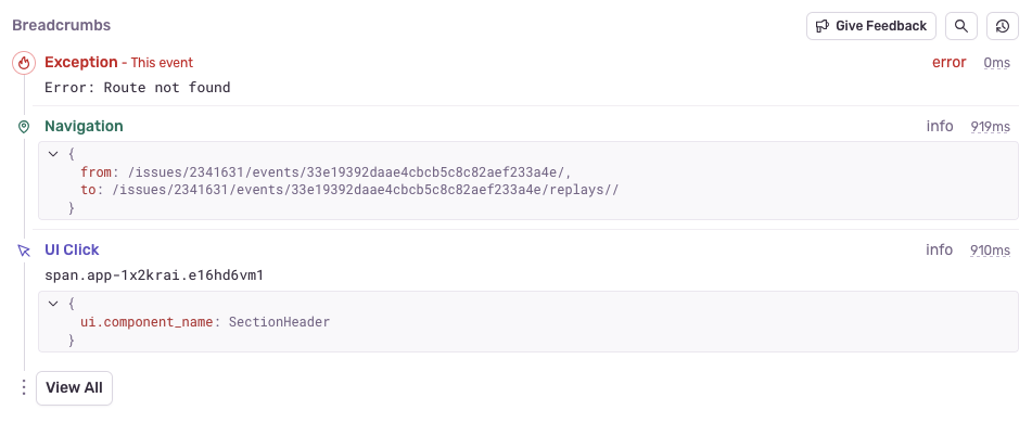 If an error event provides a trail, you'll see the breadcrumbs on the Issue Details page in Sentry.io displays .