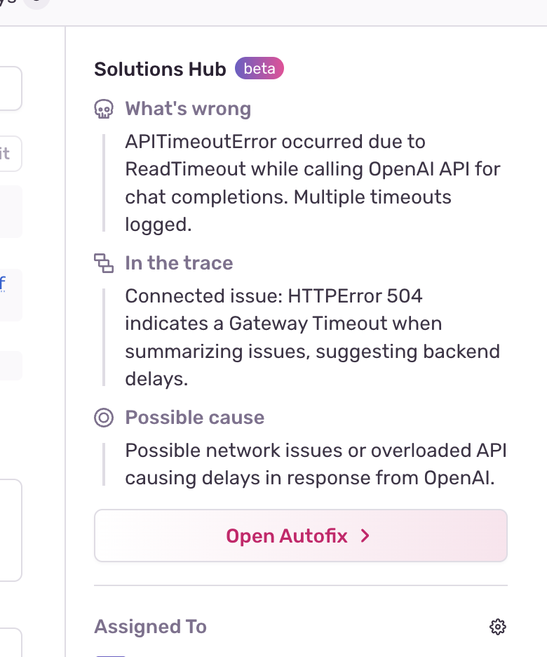 The Issue Summary provides a quick overview of an issue by highlighting key insights taken from event and issue-level metadata. You'll see a quick overview of what's going wrong, a potential cause, and if relevant, insights from trace-connected issues, all in the Solutions Hub in the sidebar: