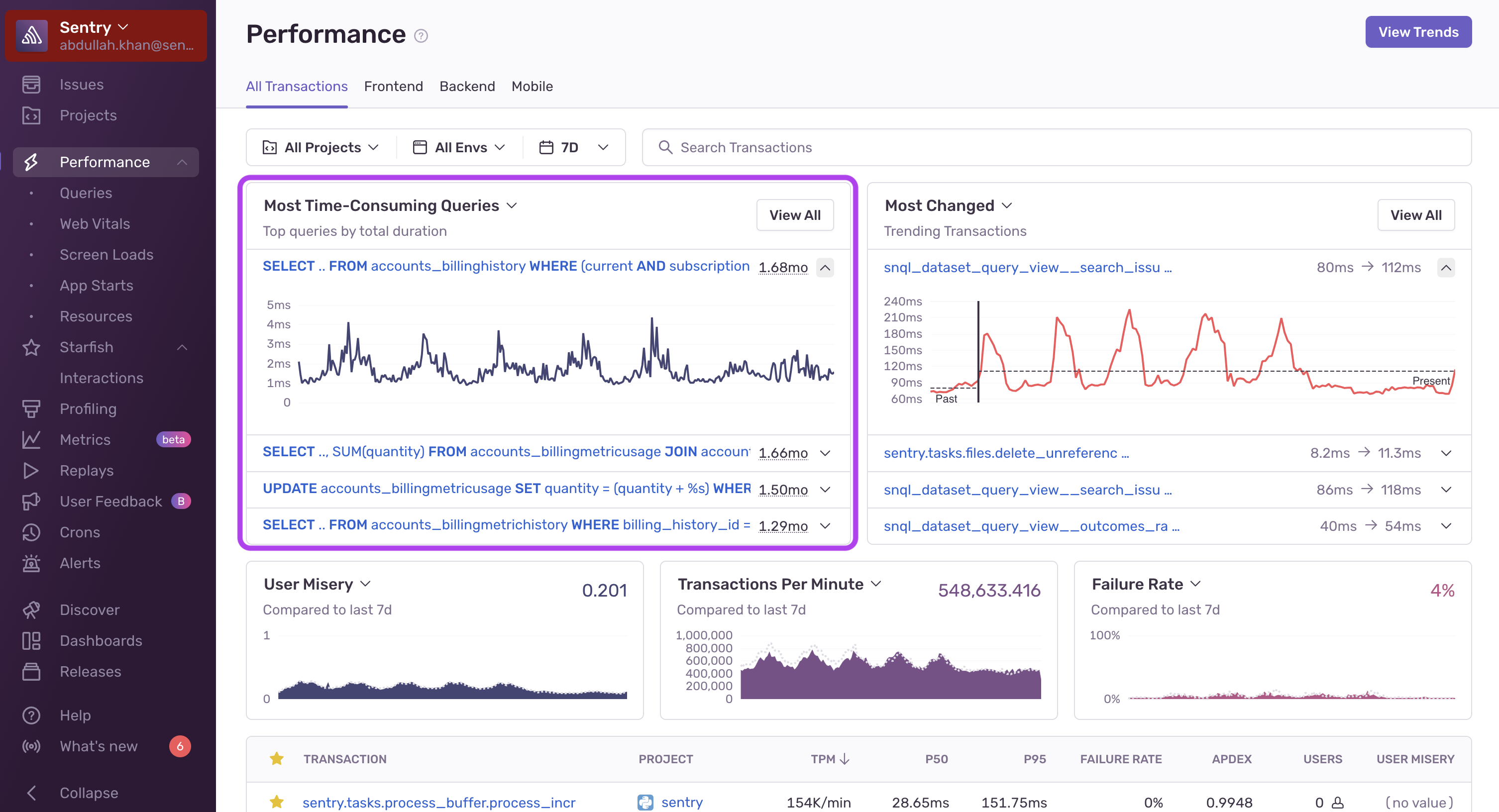 Shows database queries that take the most time in your application. These queries are usually either slow, very frequent, or both. Click on a query to open its Query Summary page or click "View All" to open the Queries page.